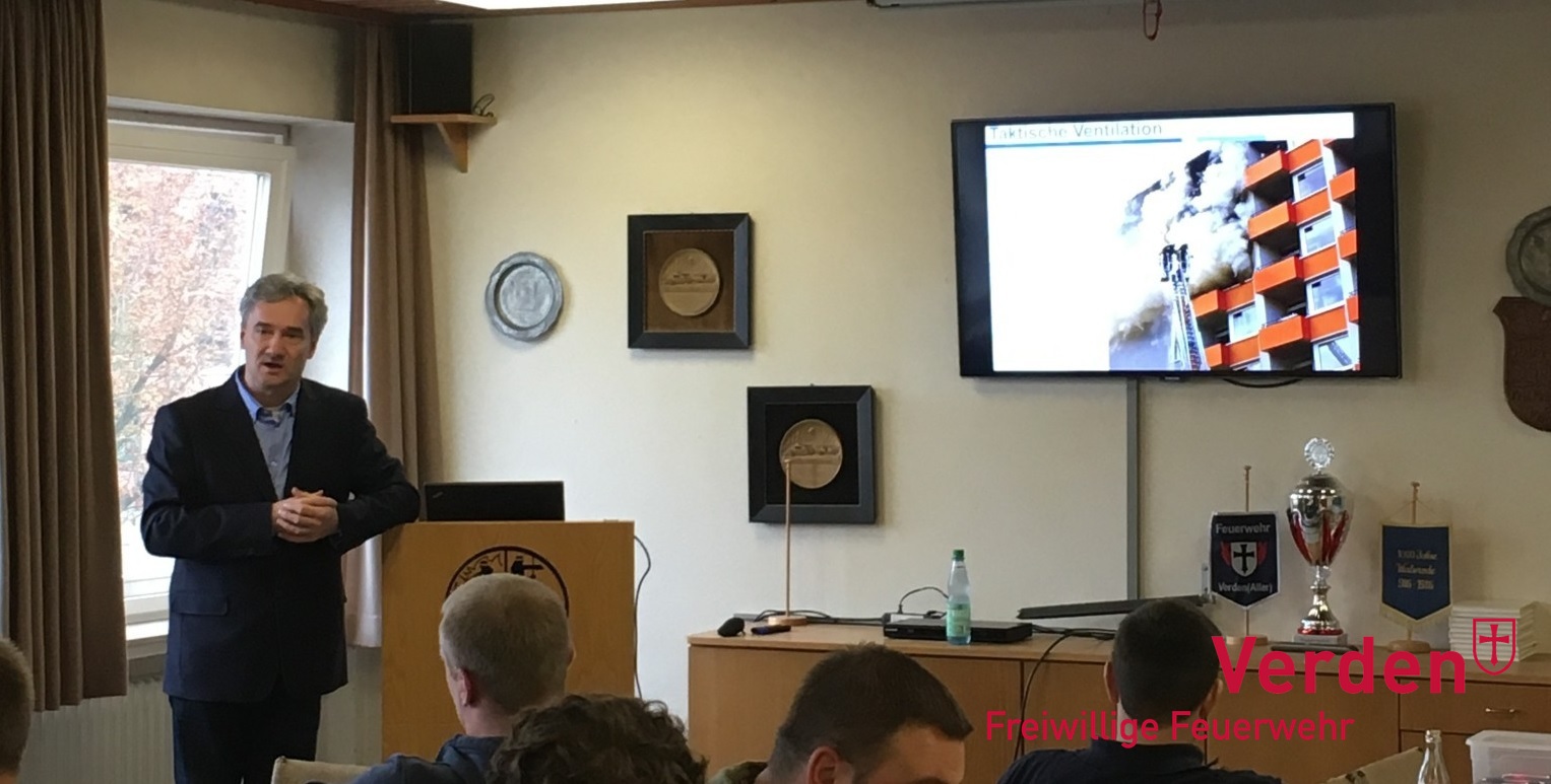Die Einsatzkräfte konnten Thorsten Bodensiek, freiberuflicher Dozent und Mitarbeiter bei der Werkfeuerwehr im VW-Werk Hannover, im Feuerwehrhaus in Verden begrüßen. Er hielt vor ca. 25 ehrenamtlichen Feuerwehrleuten einen Vortrag über den Umgang mit sogenannten Hochleistungslüftern im Feuerwehreinsatz. Organisiert wurde der Sonderdienst durch den stellvertretenden Ortsbrandmeister Tobias Burmeister.