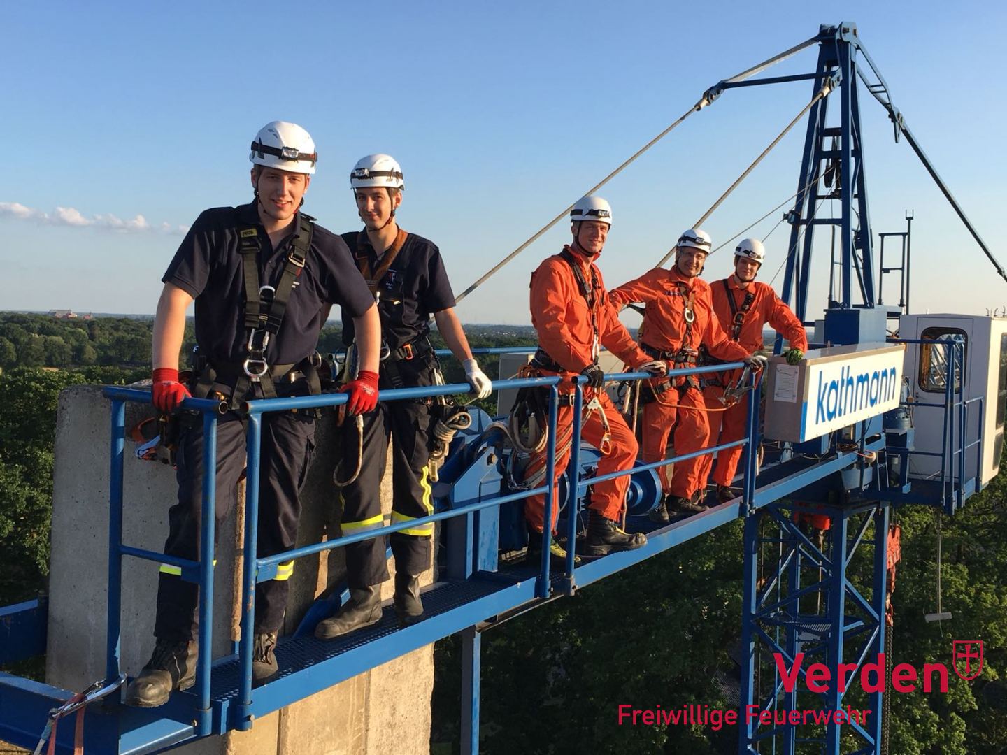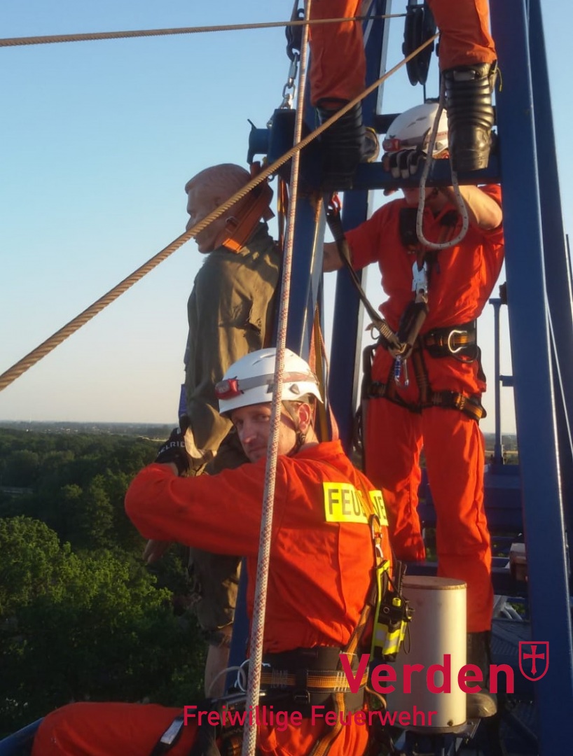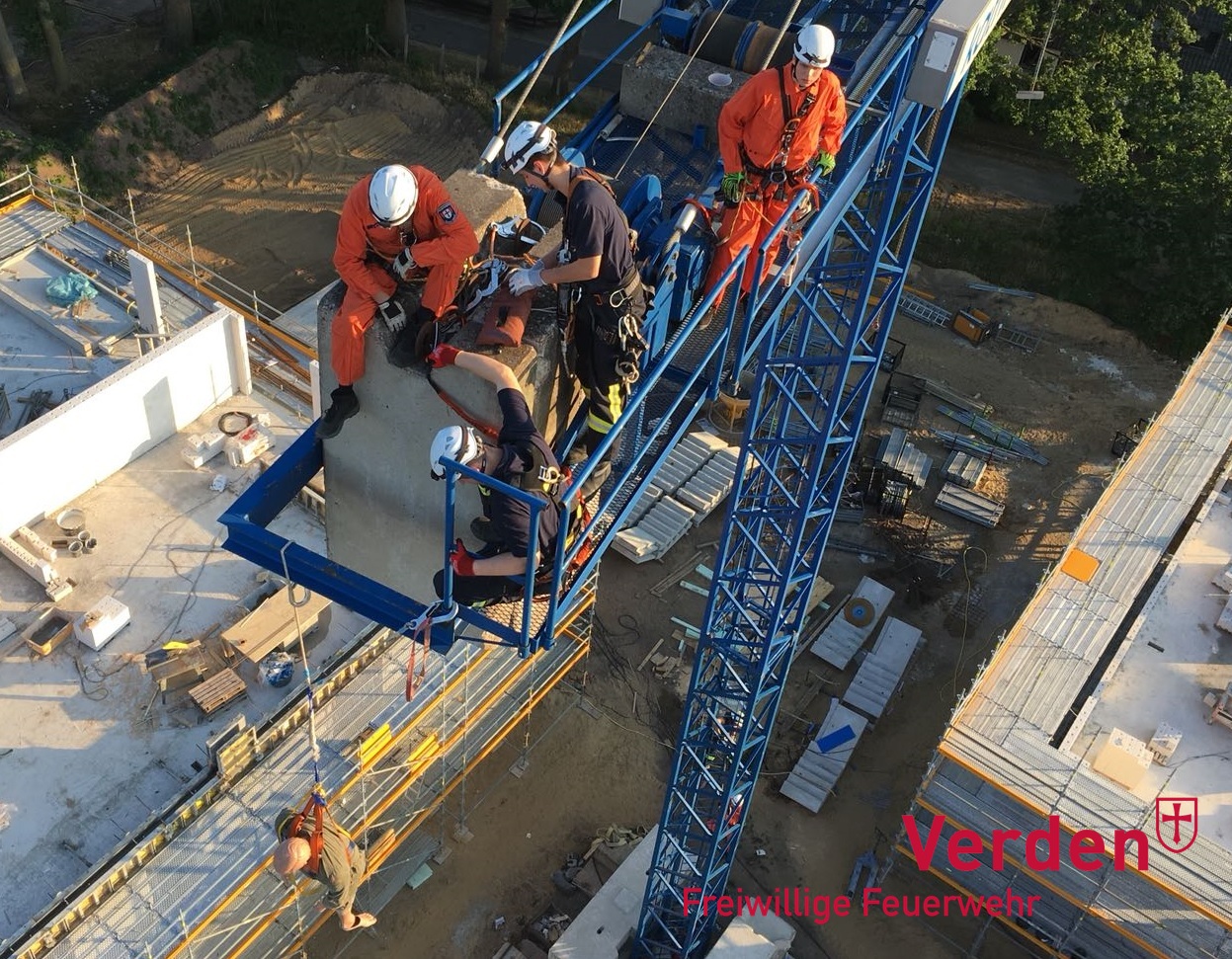 Am vergangenen Mittwoch übten die Absturzsicherungsgruppen (kurz: AbstuSi-Gruppen) der Stadtfeuerwehr Verden und der Gemeindefeuerwehr Langwedel gemeinsam den Aufstieg sowie die Sicherung einer Verletzten Person auf zwei Baukränen im Verdener Ortsteil Dauelsen. Rund 20 Mitglieder der Ortsfeuerwehren Dauelsen, Daverden, Lagwedel und Verden nutzten so, die ihnen gebotene Möglichkeit, zum gemeinsamen Übungsdienst auf einer Baustelle.