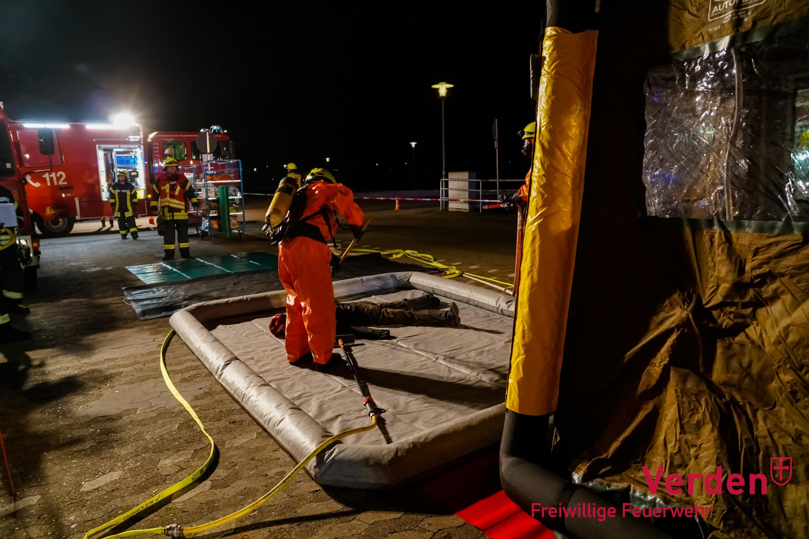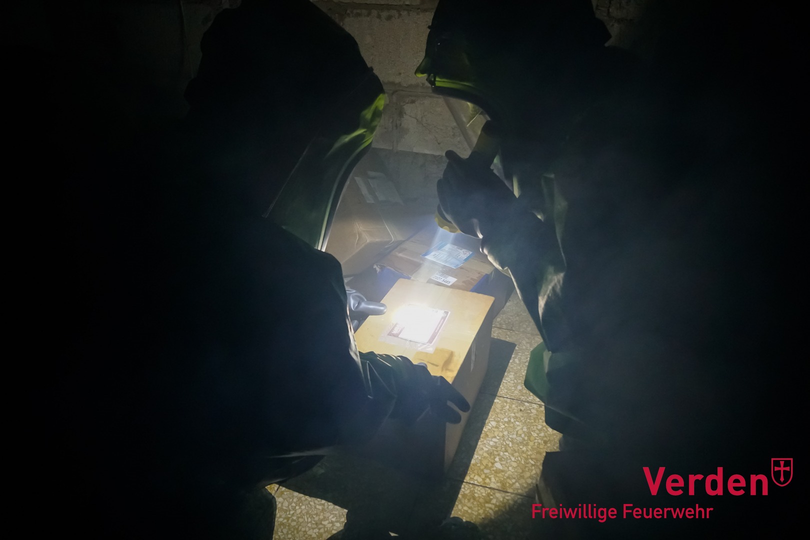 Im Rahmen des zweiwöchentlichen Ausbildungsdienstes fand am Dienstagabend eine Übung der Ortsfeuerwehr Verden an der ehemaligen Kaufhalle statt. Bei Verladearbeiten war es zur Beschädigung an zwei Paketen gekommen, woraufhin aus diesen Flüssigkeiten ausliefen. Beide Flüssigkeiten reagierten anschließend unter starker Dampfbildung, wobei eine Person beim Versuch die beschädigten Pakete ins Freie zu bringen, das Bewusstsein verlor und im Gebäude als vermisst galt. Der Hausmeister kam durch Zufall vorbei und alarmierte nach Inaugenscheinnahme der Unfallstelle daraufhin die Feuerwehr.