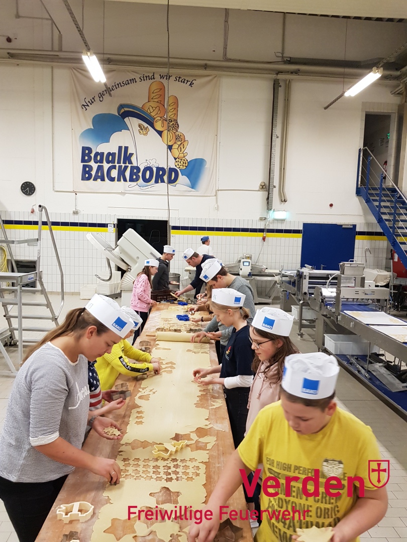 Kurz vor den Weihnachtsfeiertagen hatten sowohl die Löschverdis, die Kinderfeuerwehr der Ortsfeuerwehren Hönisch-Hutbergen und Verden, als auch die Jugendfeuerwehren Eitze und Hönisch-Hutbergen noch die Möglichkeit Weihnachtsplätzchen zu backen. In der Backstube von Baalk Backbord in der Max-Planck-Straße konnten die Kinder und Jugendlichen ihre Plätzchen unter fachmännischer Anleitung der beiden Bäcker Daniel Teubert und Patrick Feuße, beide auch aktive Mitglieder der Ortsfeuerwehr Hönisch-Hutbergen, frei gestalten und backen. Nebenbei erhielten sie auch Einblicke in den Arbeitsablauf einer modernen Backstube und konnten natürlich die selbst gebackenen Plätzchen mit nach Hause nehmen. Einen herzlichen Dank an dieser Stelle auch nochmal an die Bäckerei Baalk Backbord für die Möglichkeit und Unterstützung.
