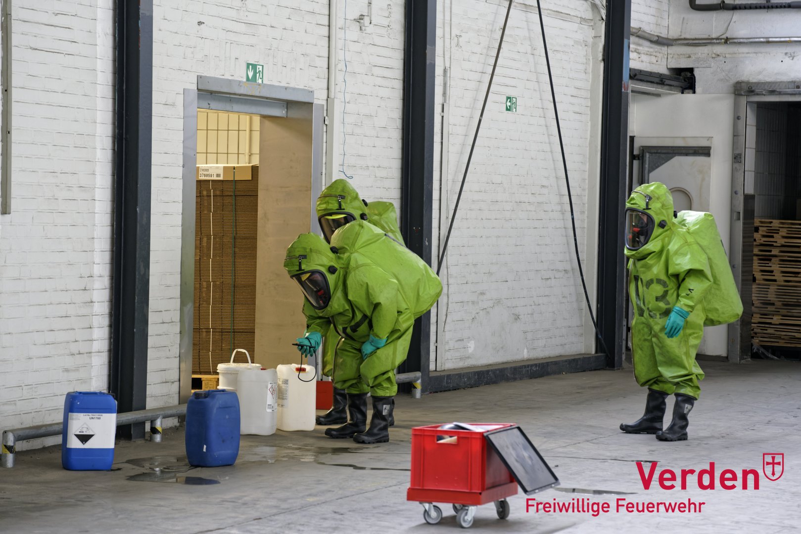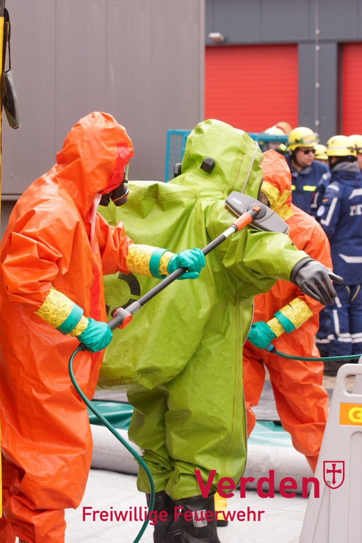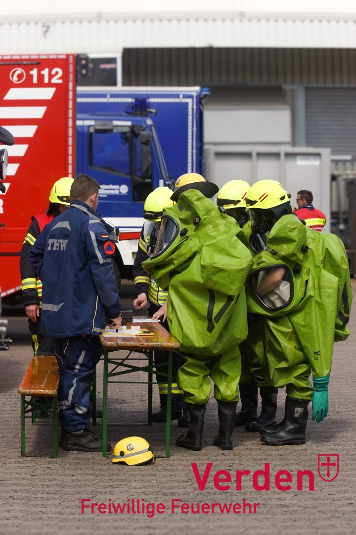 Zwei realistische Einsatzszenarien galt es abzuarbeiten, die zum einen den Umgang mit den Spezialgerätschaften und die Abläufe eines Gefahrguteinsatzes schulen, zum anderen aber auch die Zusammenarbeit zwischen den Ortsfeuerwehren Scharnhorst, Verden und Walle sowie dem THW Ortsverband Verden vertiefen sollte.
