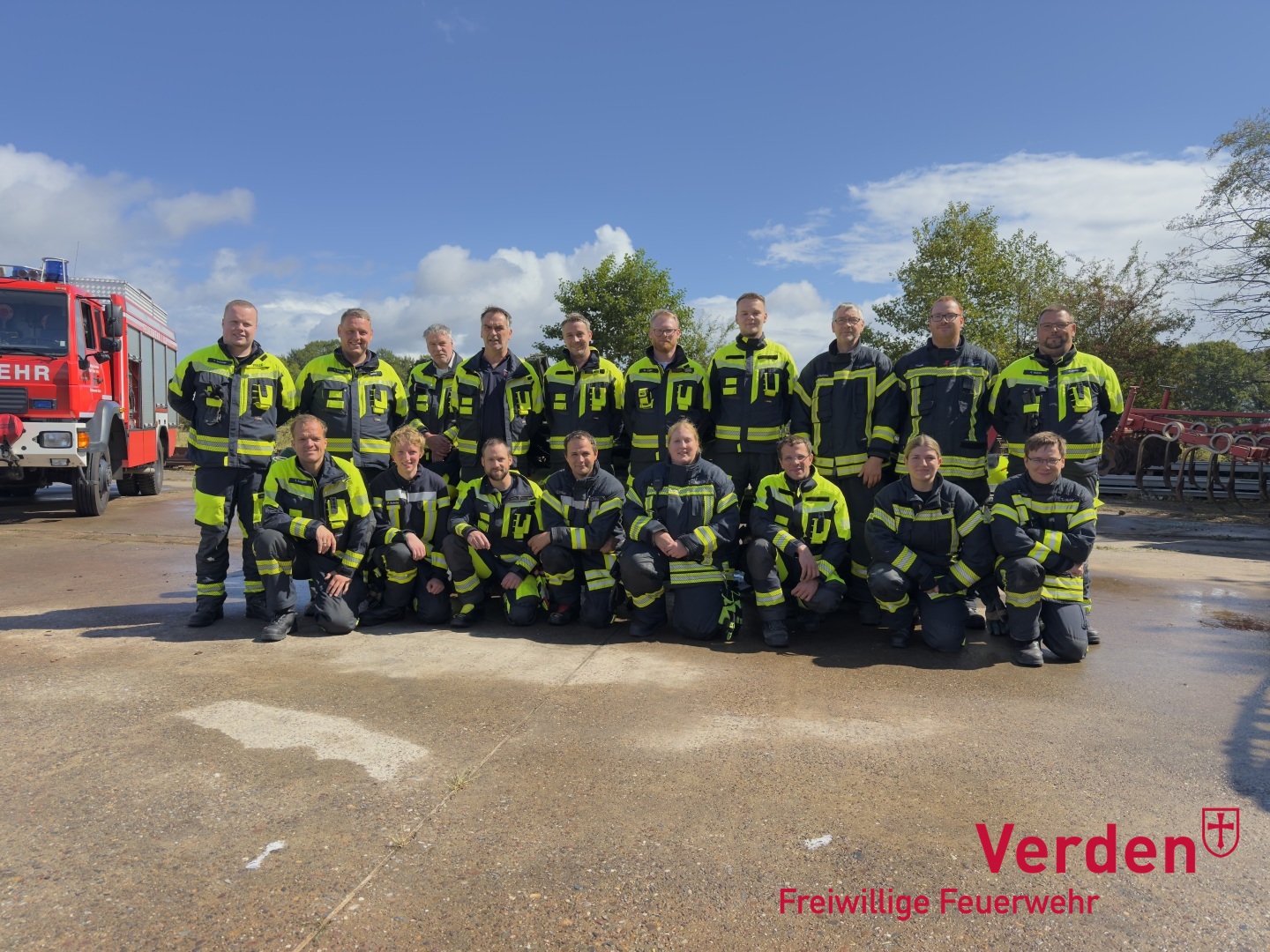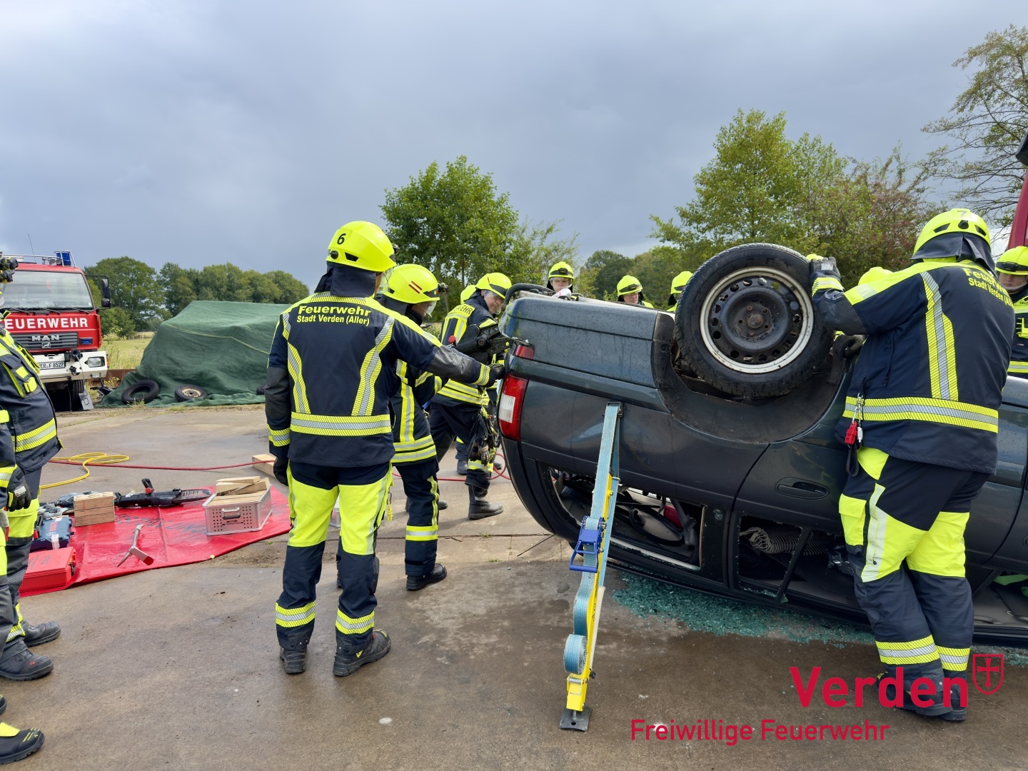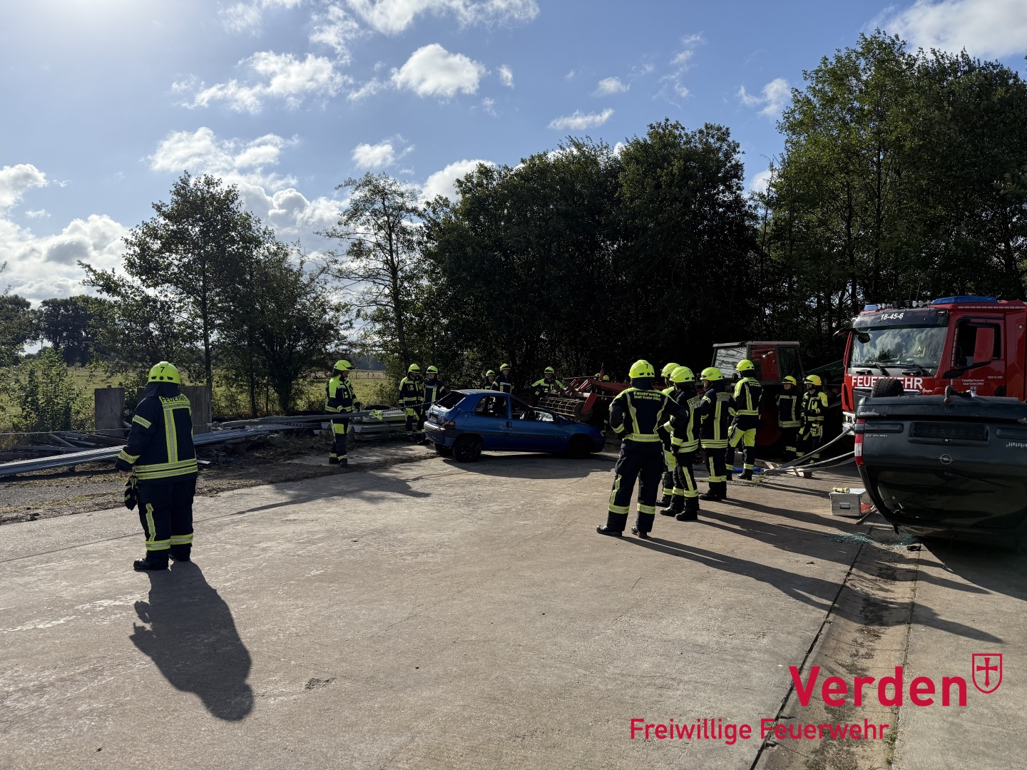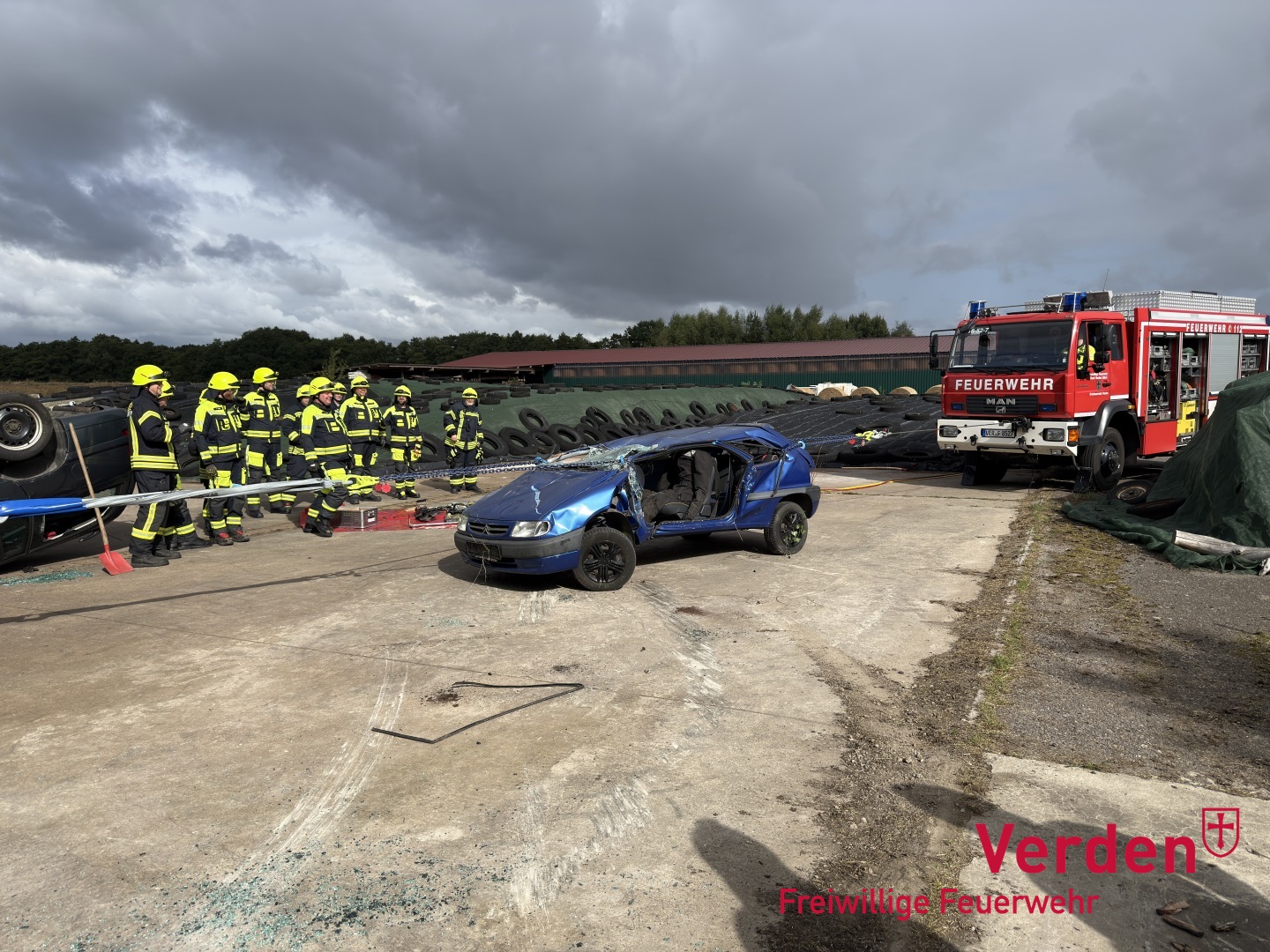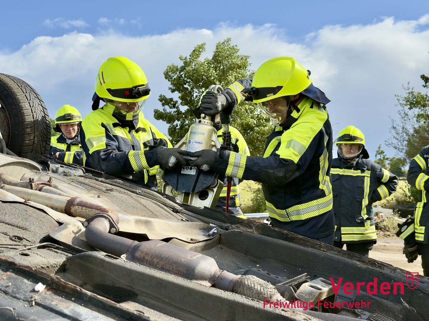 Es galt für die ca. 20 Einsatzkräfte zwei Übungslagen abzuarbeiten. Bei der ersten Lage hat ein Trecker mit einem angehängten Grubber den frontalen Bereich eines PKWs so eingedrückt, dass eine Person dabei eingeklemmt wurde. Nachdem das Arbeitsgerät vom Trecker durch Unterbauen gegen Wegrutschen gesichert wurde, ist durch die Kettenrettung das Auto gerade gezogen worden. Im Anschluss wurden die Türen abgenommen und die Glasscheiben entfernt. Abschließend wurde der PKW durch den Kettenzug auseinandergezogen und die Person konnte befreit werden. Nach einer kurzen Trinkpause ging es mit der zweiten Lage weiter. Ein PKW ist nach einem Crash auf dem Dach gelandet und eine Person wurde dabei eingeklemmt. Hier wurden zunächst die Heckklappe sowie die Türen entfernt und das Dach mithilfe hydraulischen Rettungsgeräts an den Säulen durchtrennt. Abschließend wurde das Dach einschließlich der Person mithilfe der Kettenrettung unter dem Fahrzeug herausgezogen. Bei beiden Lagen galt das Scharnhorster Löschgruppenfahrzeug als Fixpunkt, während der Verdener Rüstwagen mit Ihrer hydraulischen Seilwinde gezogen hat.