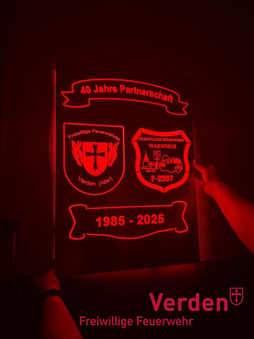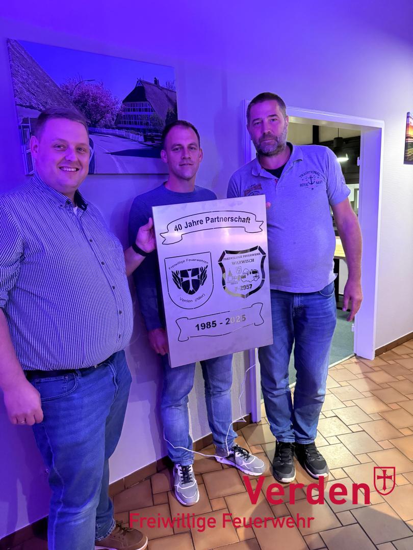 Im Oktober 2025 blickten die Kameraden aus Warwisch und Verden nun auf eine daraus entstandene 40jährige Freundschaft zurück. Diese wurde in gebührendem Rahmen mit einem Kameradschaftsessen in Hamburg begangen. Hierbei nutzen die Verdener Einsatzkräfte auch die Gelegenheit den Kameraden aus Hamburg als Zeichen der Freundschaft ein Geschenk zu überreichen.