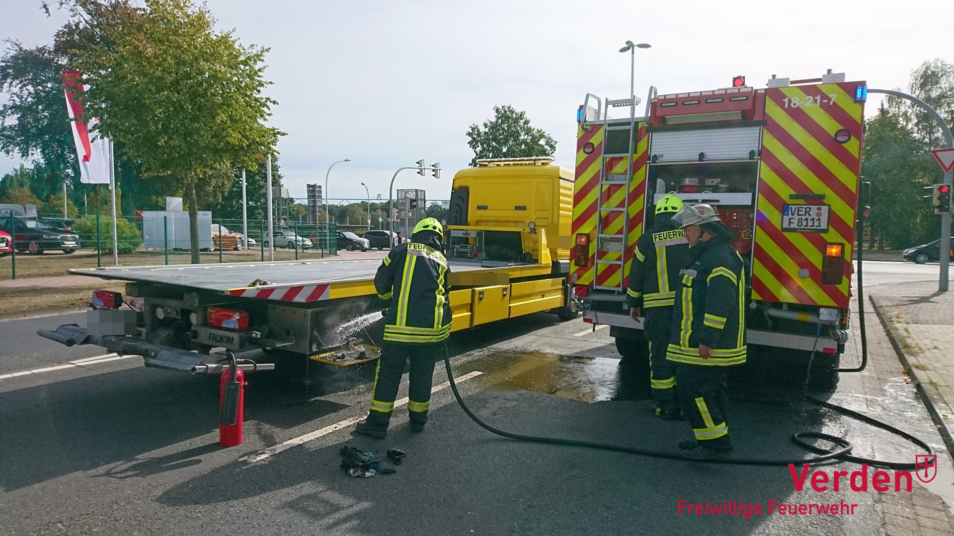 Noch während des Einsatzes in Borstel, erreichte die Meldung über einen Fahrzeugbrand an der Artilleriestraße die Brandschützer. Umgehend rückten weitere Einsatzkräfte vom Feuerwehrhaus aus, um den neuen Einsatz abzuarbeiten. Vor Ort wurde ein Schwelbrand in einem Abschleppwagen vorgefunden, welcher bereits von Passanten vor Ort mit einem Feuerlöscher eingedämmt wurde, so dass sich die Feuerwehr auf eine Kontrolle des Fahrzeuges sowie Nachlöscharbeiten beschränken konnte.