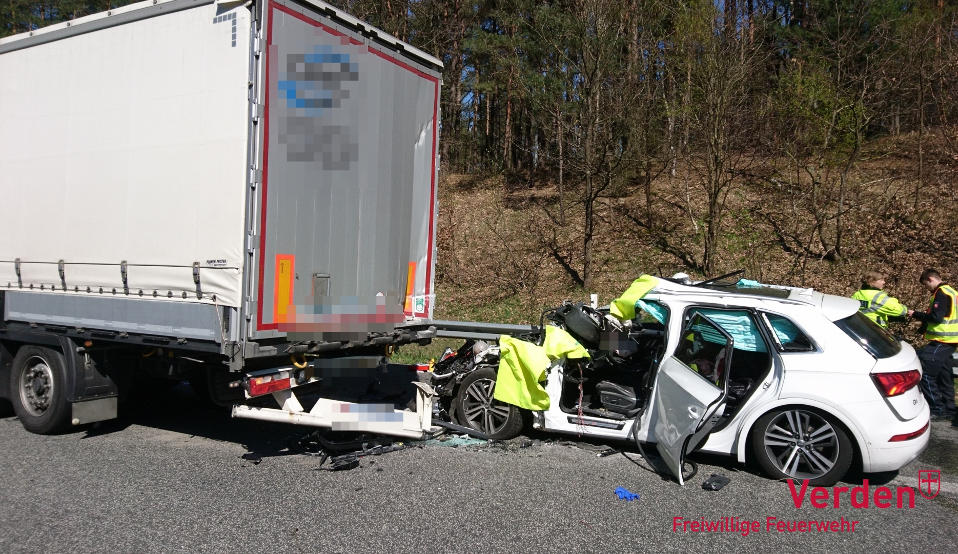 Einsatzkräfte der Ortsfeuerwehren Verden und Kirchlinteln sowie der FTZ befreiten die junge Frau aus den Trümmern ihres Fahrzeuges. Aufgrund der starken Verformung des PKW gestallte sich die Arbeit der Feuerwehr recht aufwendig. Nur durch den Einsatz verschiedener hydraulischer Rettungsgeräte gelang die Rettung der lebensgefährlich verletzten Fahrerin. Zudem musste für die Rettungsmaßnahmen der LKW mit weiterem technischem Gerät durch die Feuerwehr angehoben werden.