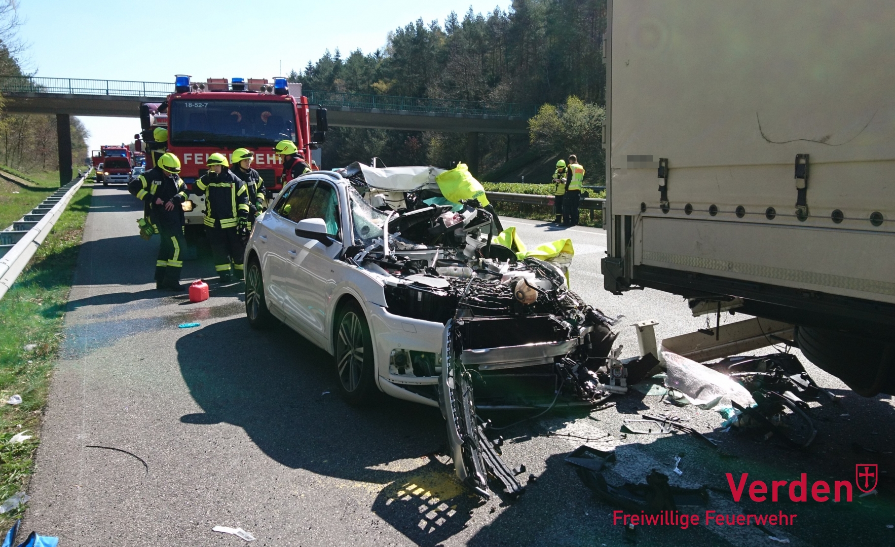 Am Mittwoch wurden die Ortsfeuerwehren Verden und Kirchlinteln sowie die feuerwehrtechnische Zentrale (FTZ) des Landkreises Verden zu einem schweren Verkehrsunfall auf die Bundesautobahn (BAB 27) alarmiert. Aus bislang ungeklärter Ursache war ein PKW im Stauende in das Heck eines vorausfahrenden LKW gekracht. Zwei Personen, ein Mann und eine Frau, wurden dabei schwer verletzt. Die Frau wurde in den Trümmern des Fahrzeuges eingeklemmt.