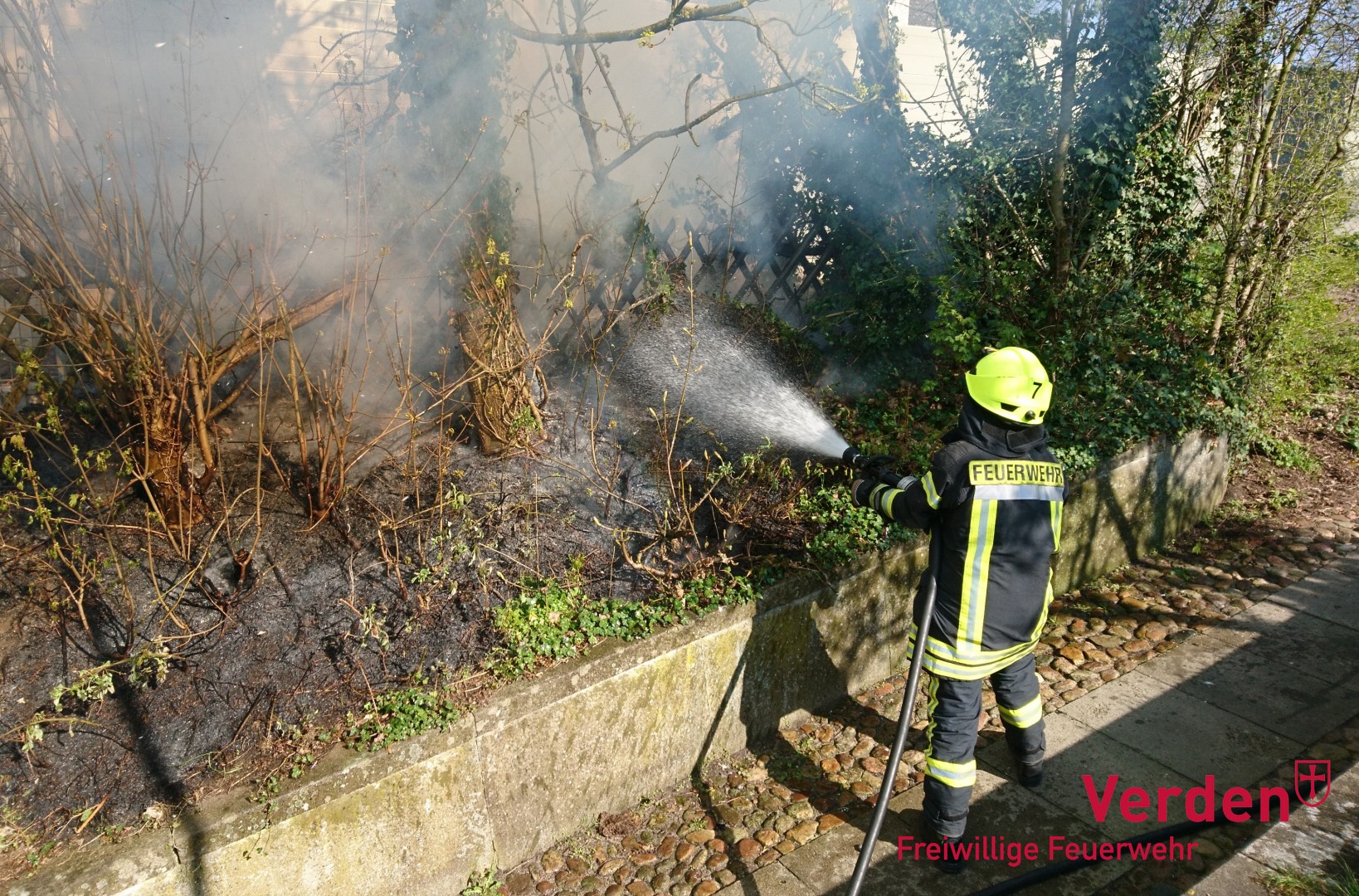 Mit Hilfe eines Tanklöschfahrzeuges konnte die Ortsfeuerwehr Verden das Feuer schnell unter Kontrolle bringen, bevor größerer Schaden entstehen konnte. Neben diversem Buschwerk wurde auch ein Jägerzaun Opfer der Flammen.