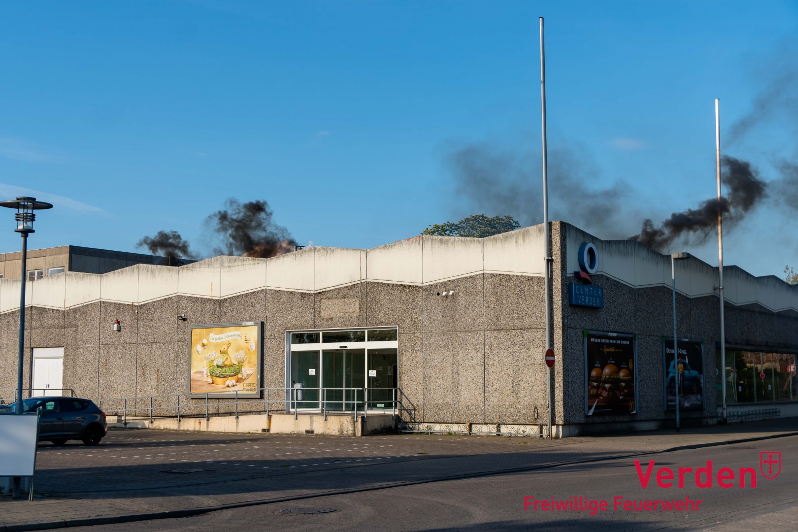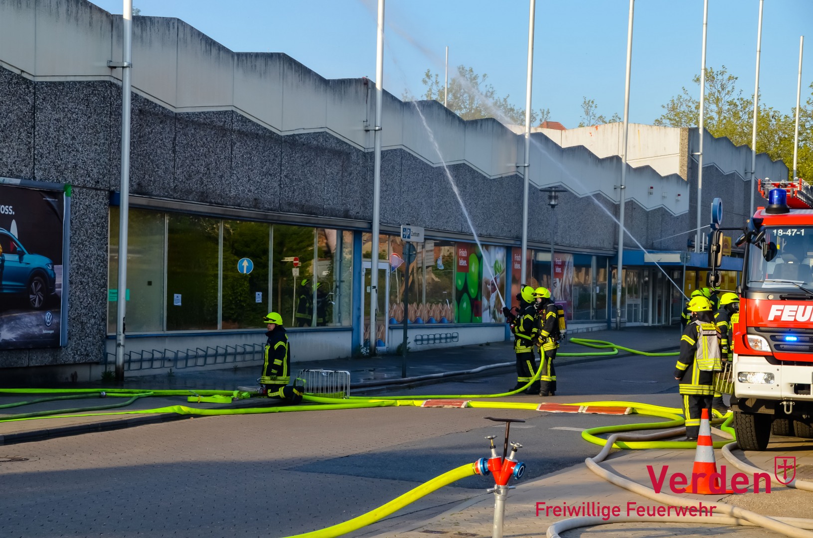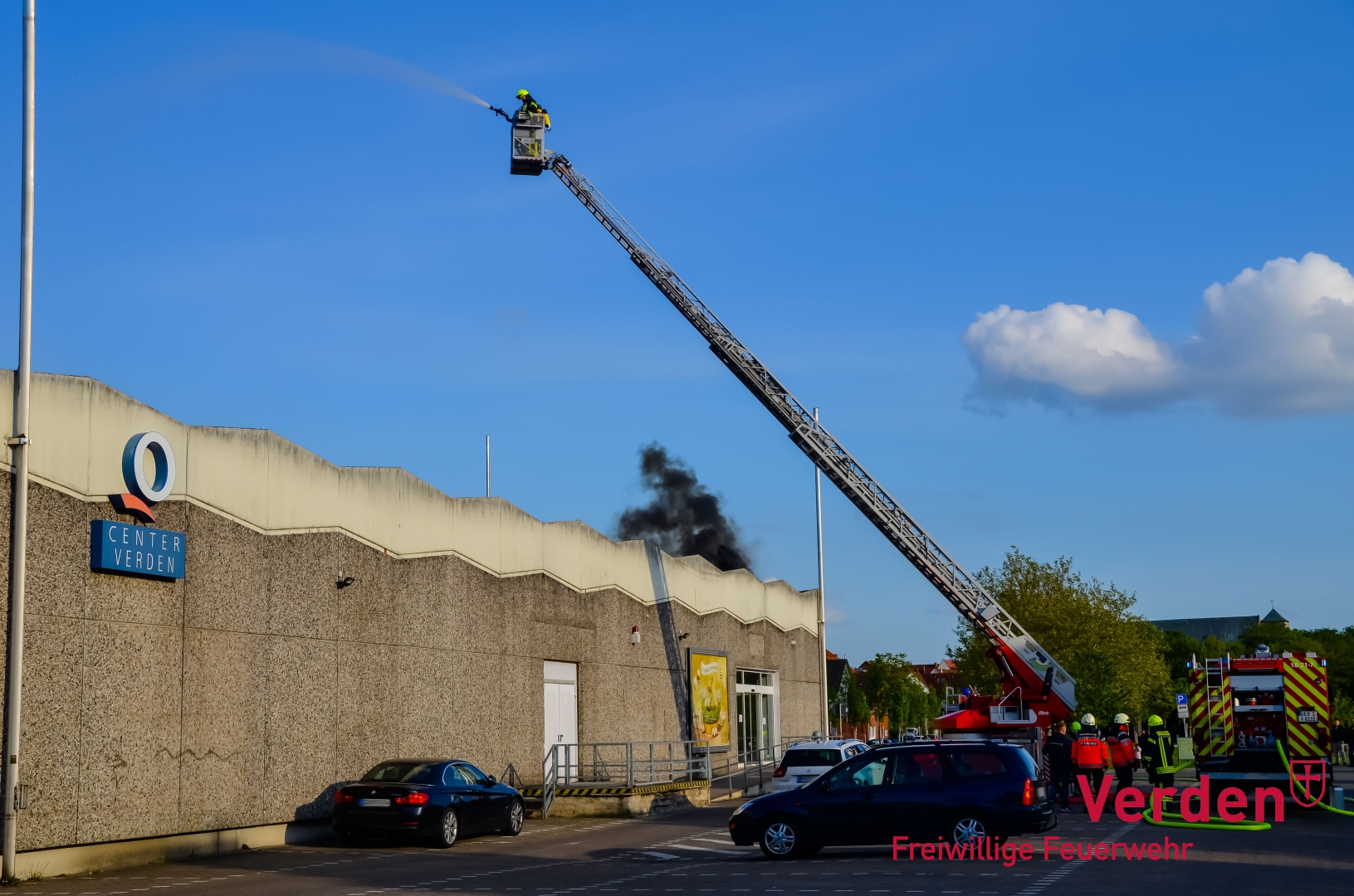 Parallel zur Menschenrettung aus dem Gebäude fand eine Brandbekämpfung von außen am Gebäude statt. Dazu wurde unter anderem Wasser aus der nahegelegenen Aller entnommen. Über mehrere Strahlrohre sowie Wenderohre wurde der mittlerweile in Vollbrand stehende Einkaufmarkt von mehreren Seiten gelöscht. Zum Abschluss der Löscharbeiten wurde der komplett verrauchte Gebäudekomplex mit einem Hochleistungslüfter entraucht.