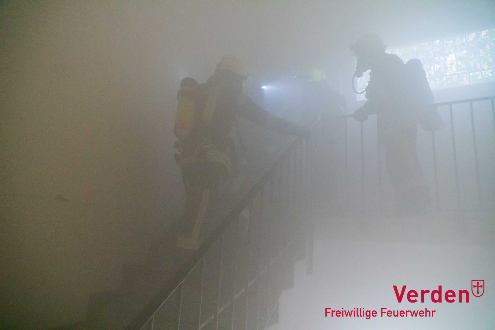Was mit Rauch- und Knalleffektkörpern begann, endete am Dienstagabend in einer großangelegten Einsatzübung von Feuerwehr und Rettungsdienst. Gegen 18:30 Uhr hatte die automatische Brandmeldeanlage der ehemaligen Kaufhalle am Allerufer ausgelöst, woraufhin die Ortsfeuerwehr Verden alarmiert wurde. Noch während der Lageerkundung durch die ersteintreffenden Einsatzkräfte kam es zu einer starken Rauchentwicklung und mehreren simulierten Explosionen, die eine schlagartige Brandausbreitung innerhalb des Einkaufsmarktes darstellen sollten. Ein aus dem Gebäude flüchtender Mitarbeiter gab den Einsatzkräften den Hinweis, dass sich noch zahlreiche Personen im mehrstöckigen Verwaltungs- und Lageranbau, der inzwischen stark verraucht war, befinden sollten. Daraufhin wurden umgehend weitere Einsatz- und Rettungskräfte der Ortsfeuerwehren Dauelsen, Döhlbergen-Rieda, Eitze und Hönisch-Hutbergen sowie vom Deutschen Roten Kreuz, der Johanniter und des Landkreis Rettungsdienstes nachalarmiert.