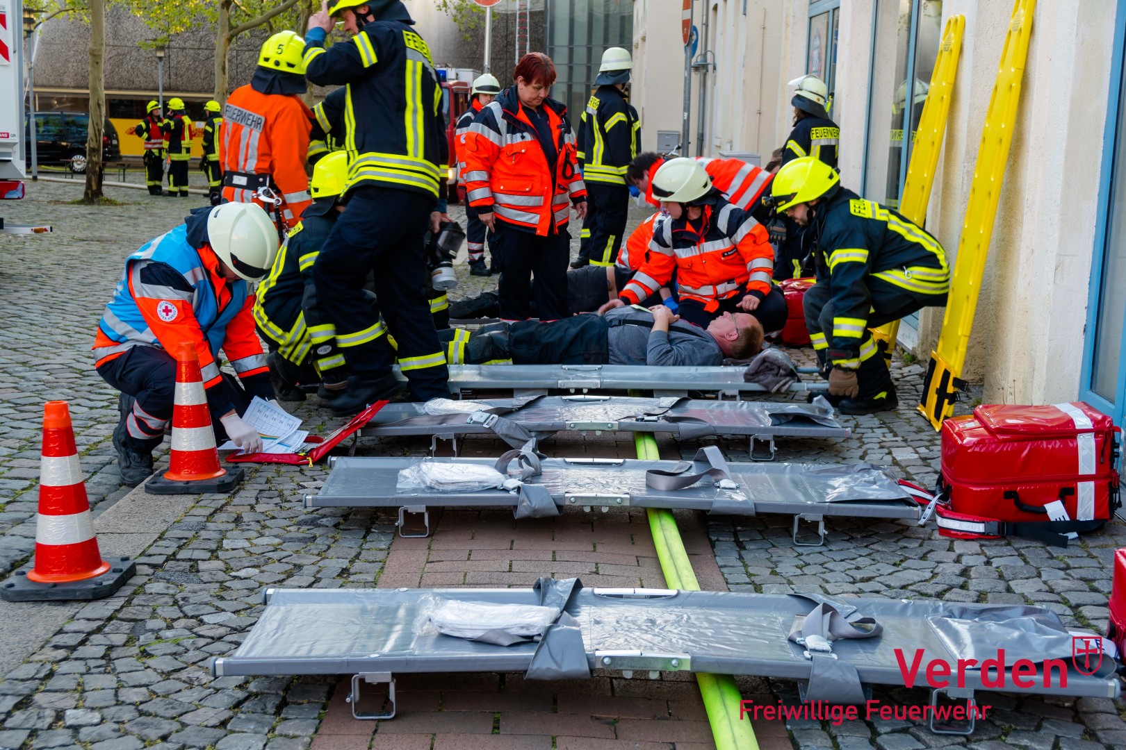 Bereits vor der Großübung war die Ortsfeuerwehr Verden mit 15 Einsatzkräften rund 30 Minuten in der Marienstraße im Einsatz, wo ein Ast auf einen PKW gefallen war. Kurz nachdem die Übung abgeschlossen war, wurde dann ein Mülleimerbrand an der Bremer Straße gemeldet. Die bereits einrückende Ortsfeuerwehr Dauelsen übernahm diesen Einsatz und konnte den Mülleimer zügig mit einer Kübelspritze ablöschen, hier waren neun Einsatzkräfte rund 20 Minuten vor Ort.