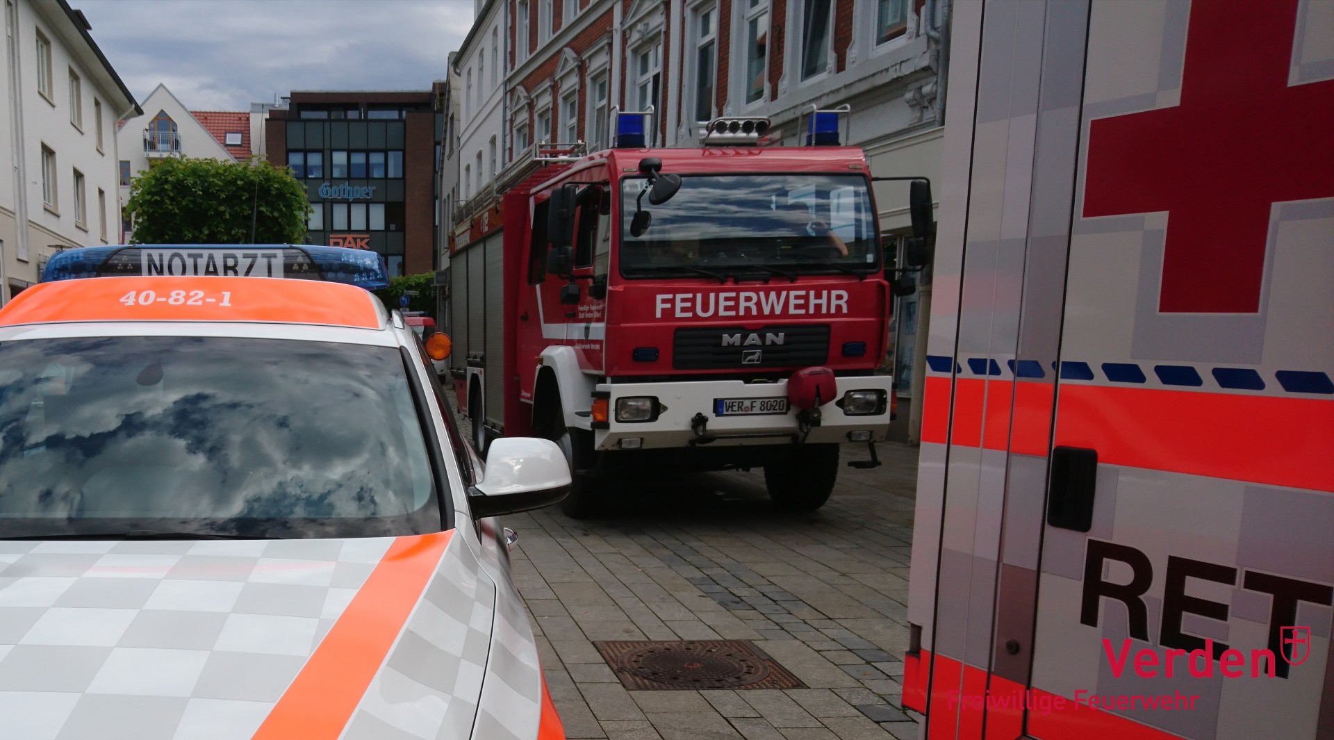 In einem Wohn- und Geschäftsgebäude in der Großen Straße kam es in einer Wohnung zu einem medizinischen Notfall. Da sich die hilflose Person in einer verschlossenen Wohnung befand, wurde neben dem Rettungsdienst auch die Ortsfeuerwehr Verden alarmiert. Mit speziellem Gerät öffneten die Einsatzkräfte die Wohnungstür im ersten Obergeschoss, damit der Rettungsdienst mit der Versorgung der erkrankten Dame beginnen konnte. Später unterstützte die Feuerwehr die Rettungskräfte noch beim Transport der Patienten in das Erdgeschoss, damit sie mit dem Rettungswagen in eine Klinik gebracht werden konnte. Nach Kurzer Zeit war der Einsatz für die Ortsfeuerwehr Verden beendet. Der Betrieb auf der Domweih wurde durch den Rettungseinsatz nicht beeinträchtigt.