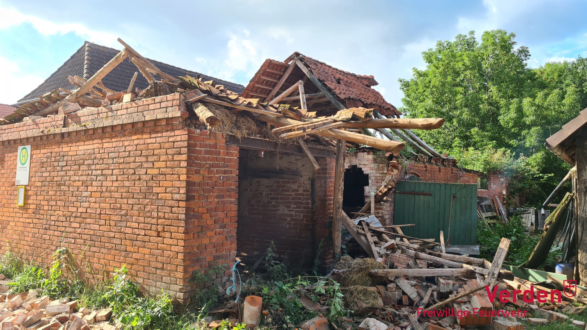 Am Donnerstagabend gegen 17.50 Uhr wurde in Hinterhönisch der Einsturz eines Gebäudes gemeldet. Aufgeschreckt durch den lauten Knall hatten Anwohner daraufhin Feuerwehr und THW alarmiert. Bereits nach kurzer Lageerkundung konnte jedoch Entwarnung gegeben werden, da es sich um das Dach einer als Unterstellmöglichkeit genutzten kleinen Scheune handelte, in der sich keine Menschen und Tiere aufgehalten hatten. Ein Großteil der Kräfte konnte die Anfahrt abbrechen, da sich die Maßnahmen der Feuerwehr lediglich auf das Absichern des Gebäudes und der näheren Umgebung beschränkten. Durch einen zusätzlich angeforderten Baufachberater des THW wurde das Gebäude auf seine Stabilität hin bewertet und letztlich durch ein Fachunternehmen niedergerissen. Anwohner versorgten die Einsatzkräfte während der Einsatzmaßnahmen bei sommerlichen Temperaturen mit Getränken.