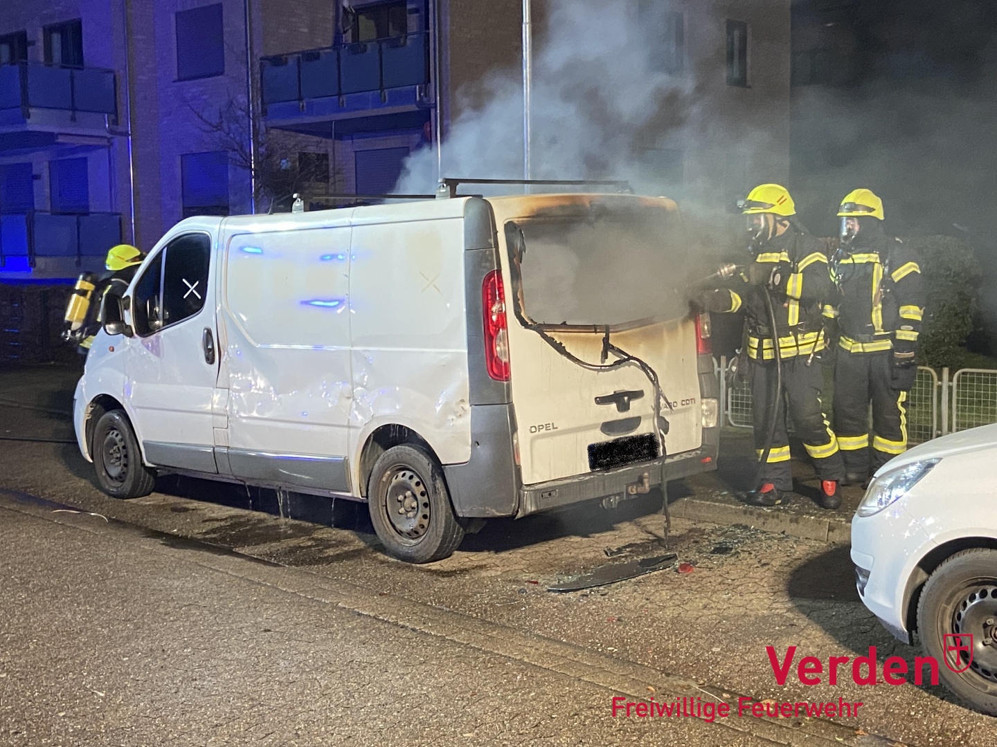 Auch wenn es schon sehr stürmisch war, so war das Wetter für den ersten Einsatz am frühen Morgen noch nicht verantwortlich. Gegen 03:30 Uhr wurde die Ortsfeuerwehr Verden zu einem Fahrzeugbrand in die Mainstraße alarmiert. Dort war aus bislang ungeklärter Ursache ein Lieferwagen in Brand geraten. Die Flammen konnten durch die Feuerwehr zügig gelöscht werden.