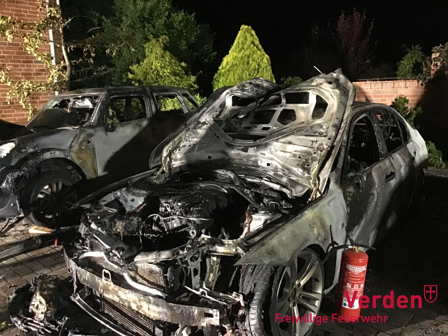 In der Nacht zu Sonntag wurde dann die Ortsfeuerwehr Dauelsen mit dem Stichwort “ brennt PKW“ in den Käthe-Kollwitz-Weg alarmiert. Vor Ort brannte schon bei Eintreffen der ersten Kräfte ein PKW in voller Ausdehnung. Zudem griff das Feuer bereits auf einen weiteren PKW über. Mittels Wasser und Schaum konnten beide PKW abgelöscht werden, ein Totalschaden an beiden Fahrzeugen konnten die Einsatzkräfte jedoch nicht mehr verhindern.