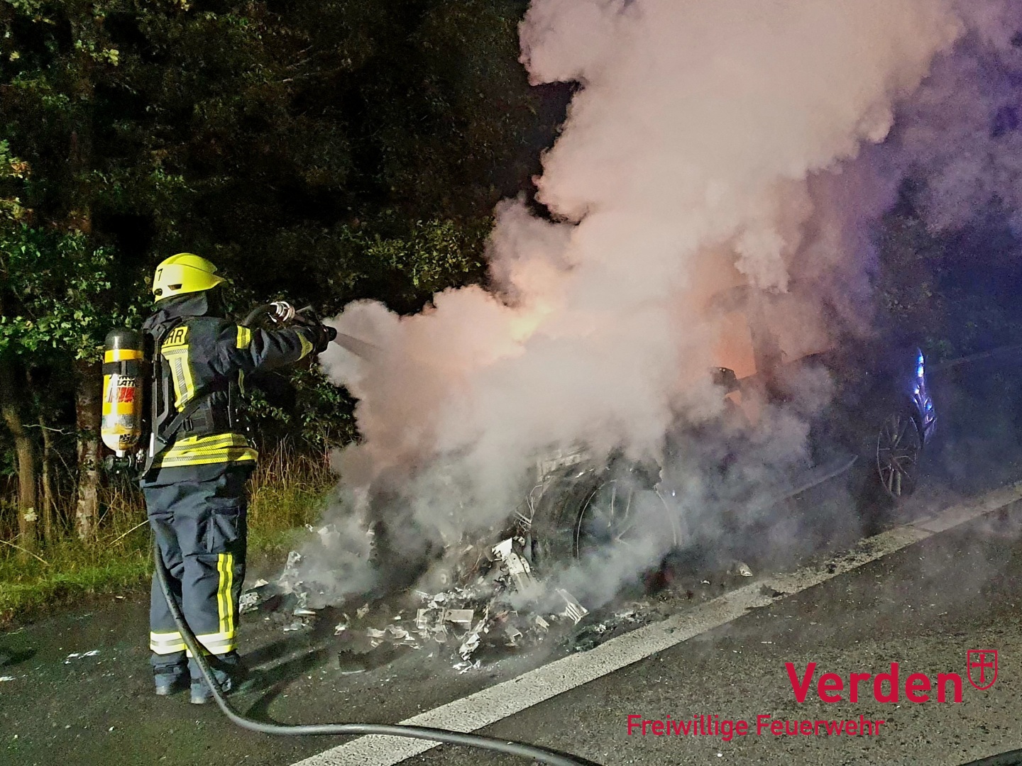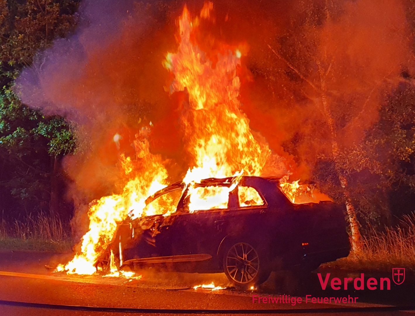 Am frühen Samstagmorgen gegen 02:18 Uhr wurde die Ortsfeuerwehr Verden auf die Autobahn alarmiert. Zwischen der Anschlussstelle Verden-Ost und Walsrode war aus bislang ungeklärter Ursache ein PKW in Brand geraten. Die beiden Insassen des Fahrzeuges wurden hierbei verletzt.