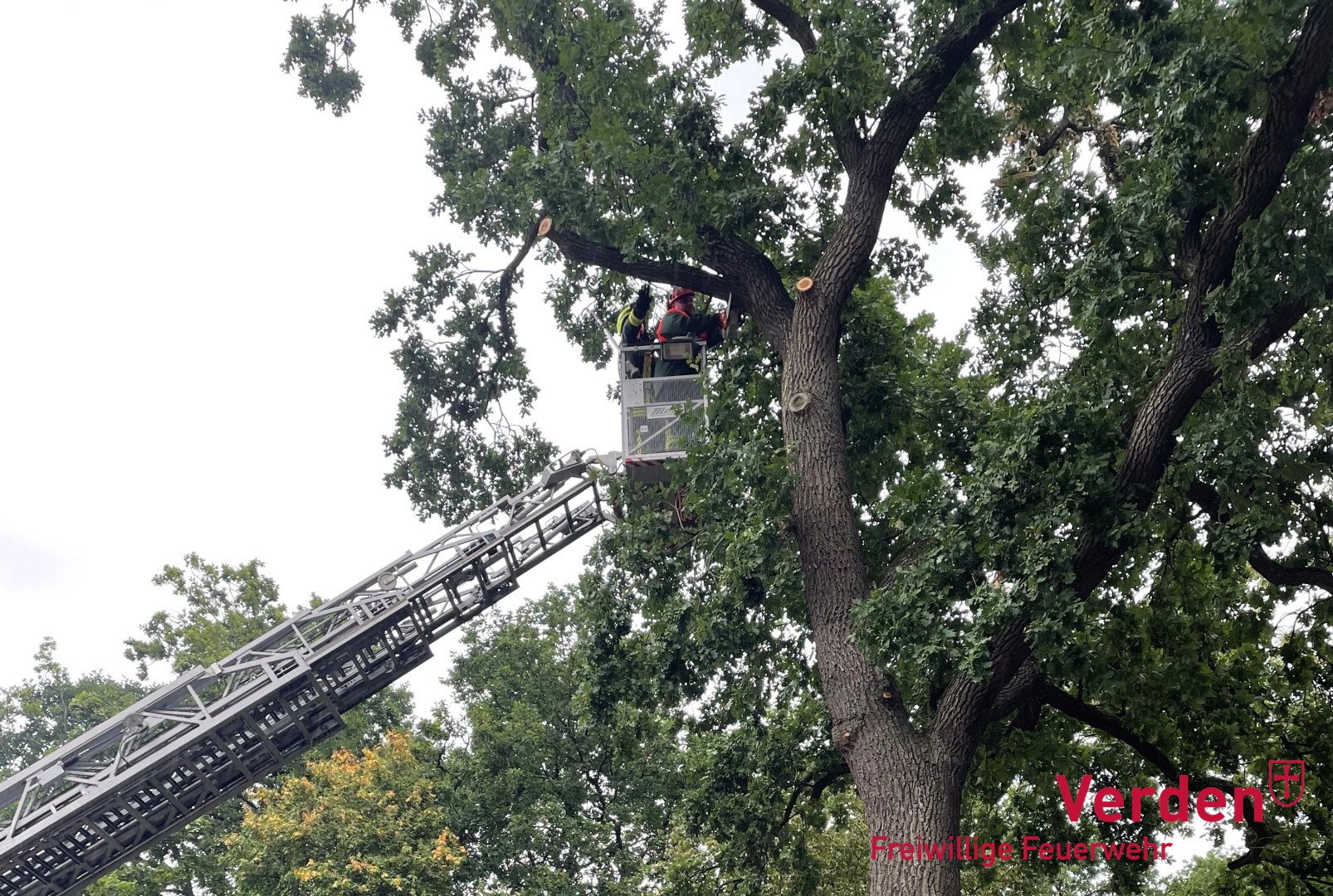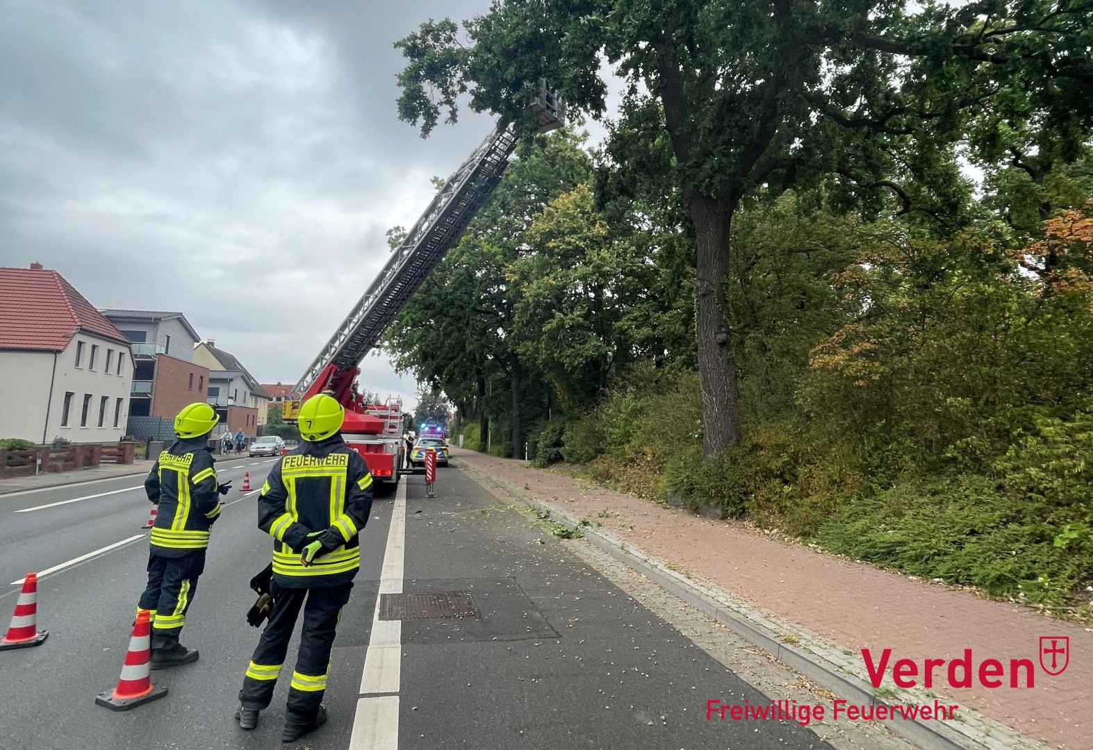 Am Samstagfrüh gegen 0730 Uhr wurde die Ortsfeuerwehr Verden zu einem Hilfeleistungseinsatz in die Bremer Straße alarmiert. In Höhe des Bürgerparks war ein 20 bis 30 Zentimeter dicker Ast abgebrochen und auf die Fahrbahn gefallen.