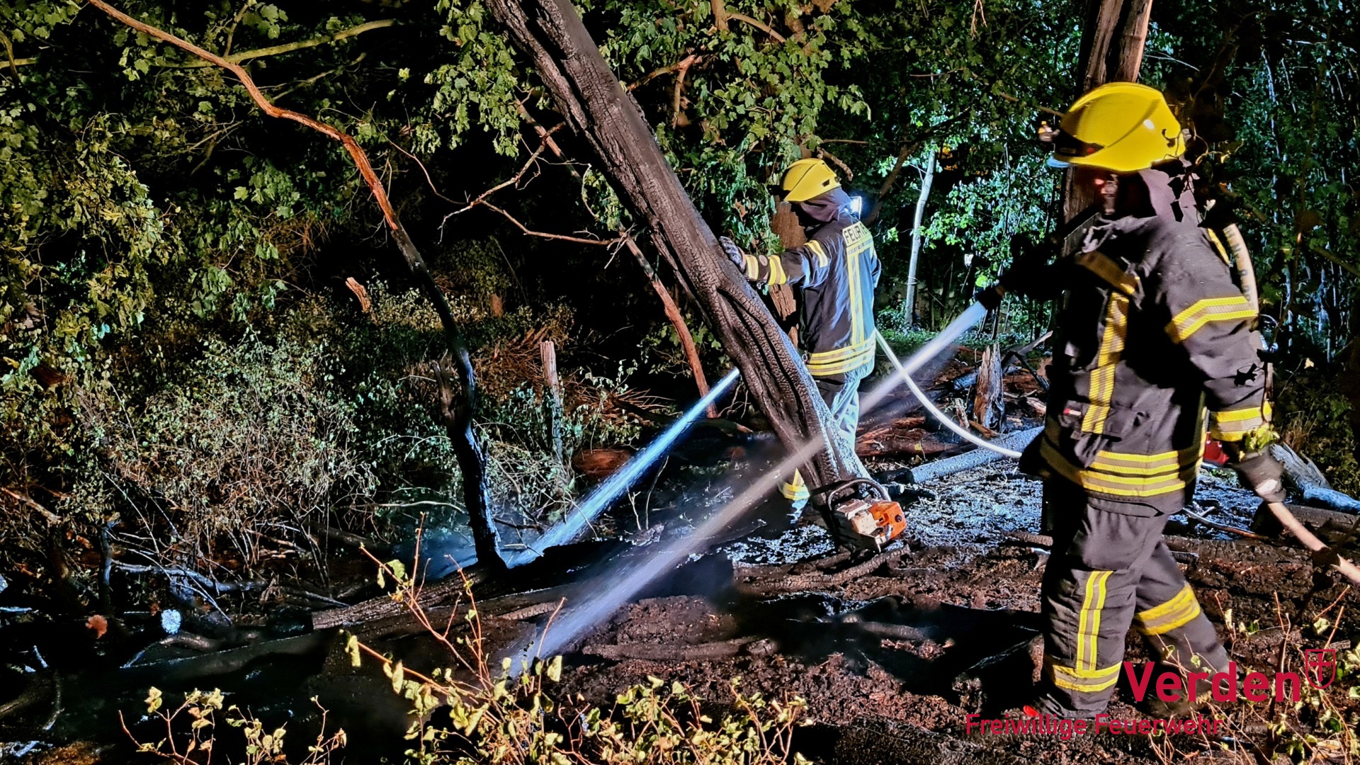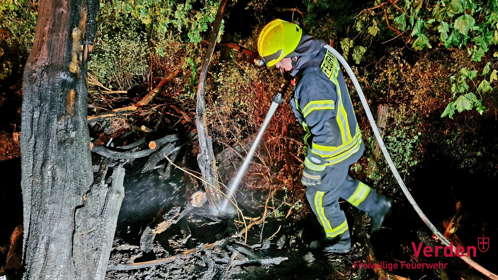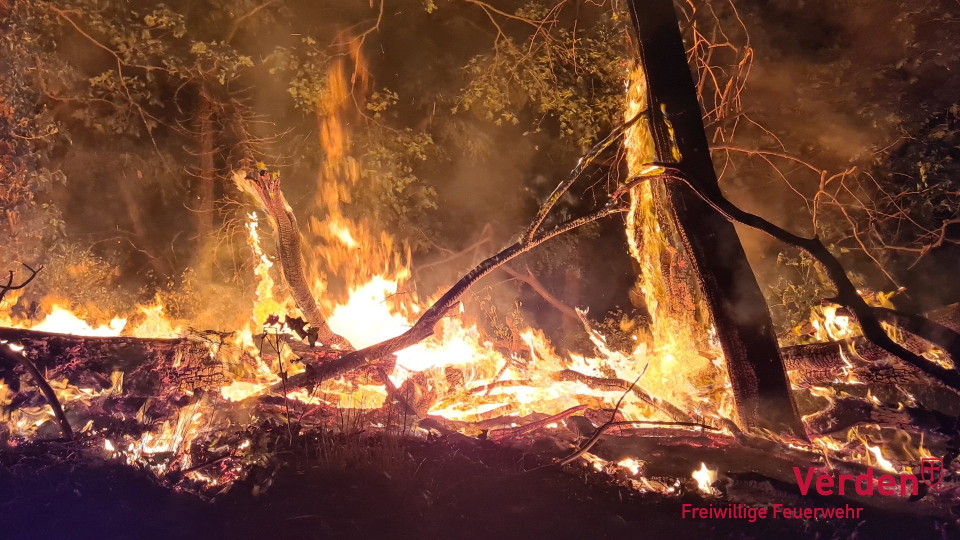 Am Mittwochabend gegen 21:30 Uhr wurde die Ortsfeuerwehr Verden zu einem Waldbrand im Bereich Friedrichstraße/Bahnhof alarmiert. Beim Eintreffen der ersten Einsatzkräfte brannte Waldboden und Totholz auf rund 100 Quadratmetern.